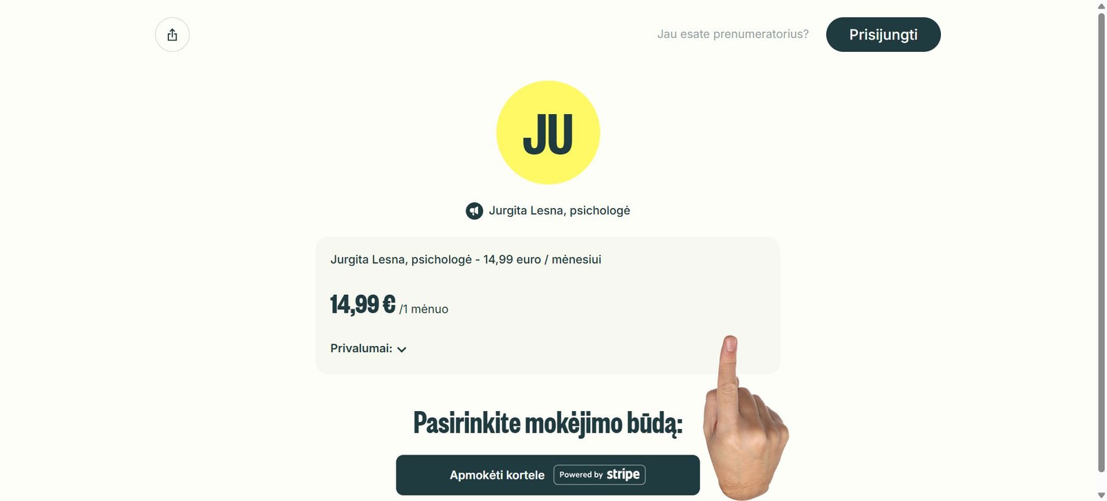 3. Jurgitos Lesnos, Telegram plano puslapyje spaudžiate mygtuką: Apmokėti kortele. Čia taip pat galite iškarto prisijungti kaip Telegram vartotojas.