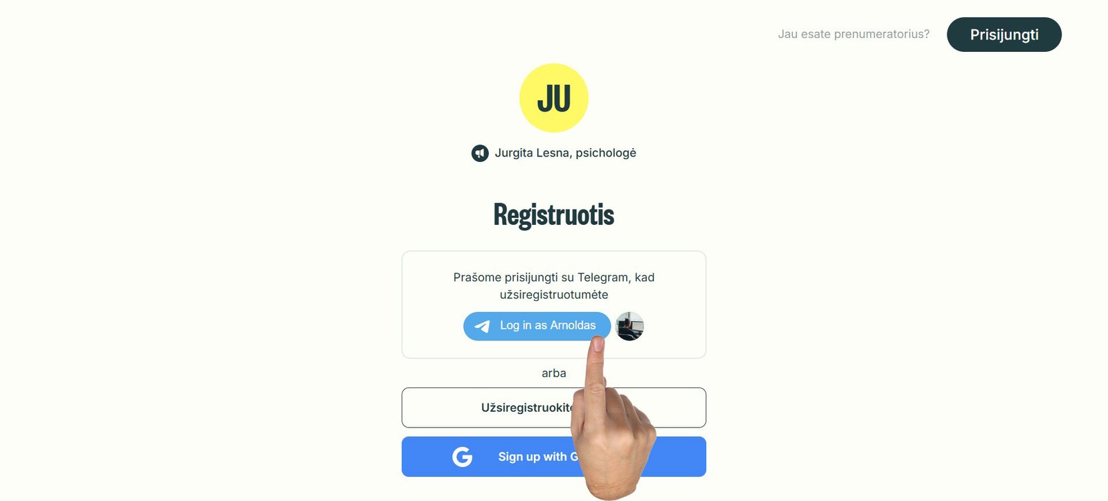 4. Jurgitos Lesnos, Telegram plano puslapyje spaudžiate mygtuką: Login as… jeigu esate prisijungę kaip Telegram vartotojas, arba galite prisijungti su Jūsų Telegram el. paštu arba per Google.