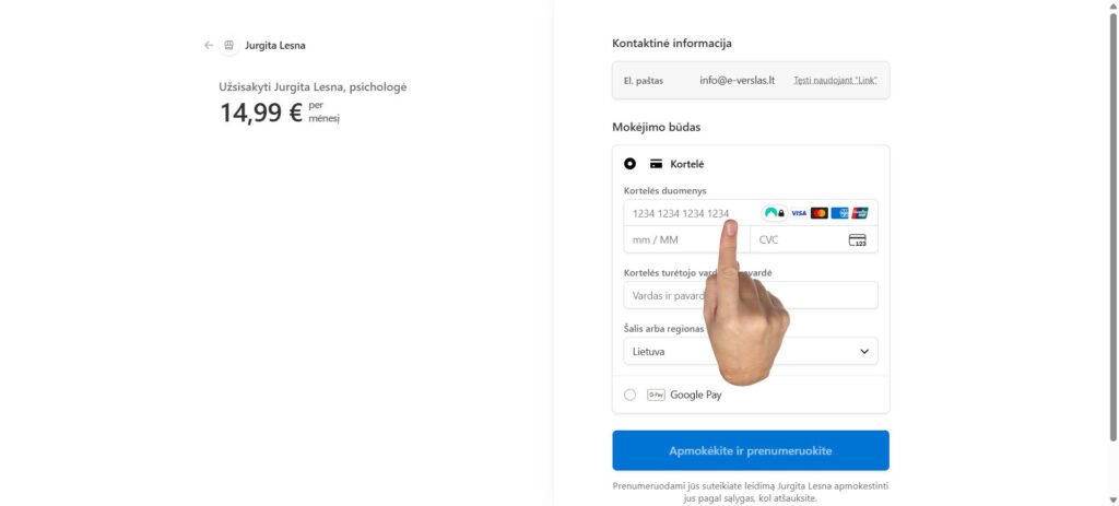 5. Jurgitos Lesnos, Telegram plano puslapyje, suvedate savo kreditinės kortelės duomenis, arba pasirenkate Google Pay ir spaudžiate mygtuką: Apmokėkite ir prenumeruokite.