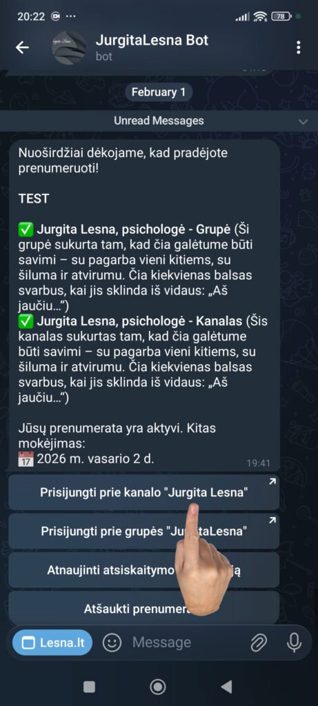 9. Telegram programoje gaunate pranešimą iš JurgitaLesna Bot, kad pradėjote prenumeruoti ir galite Prisijungti prie kanalo… arba Prisijungti prie Grupės…